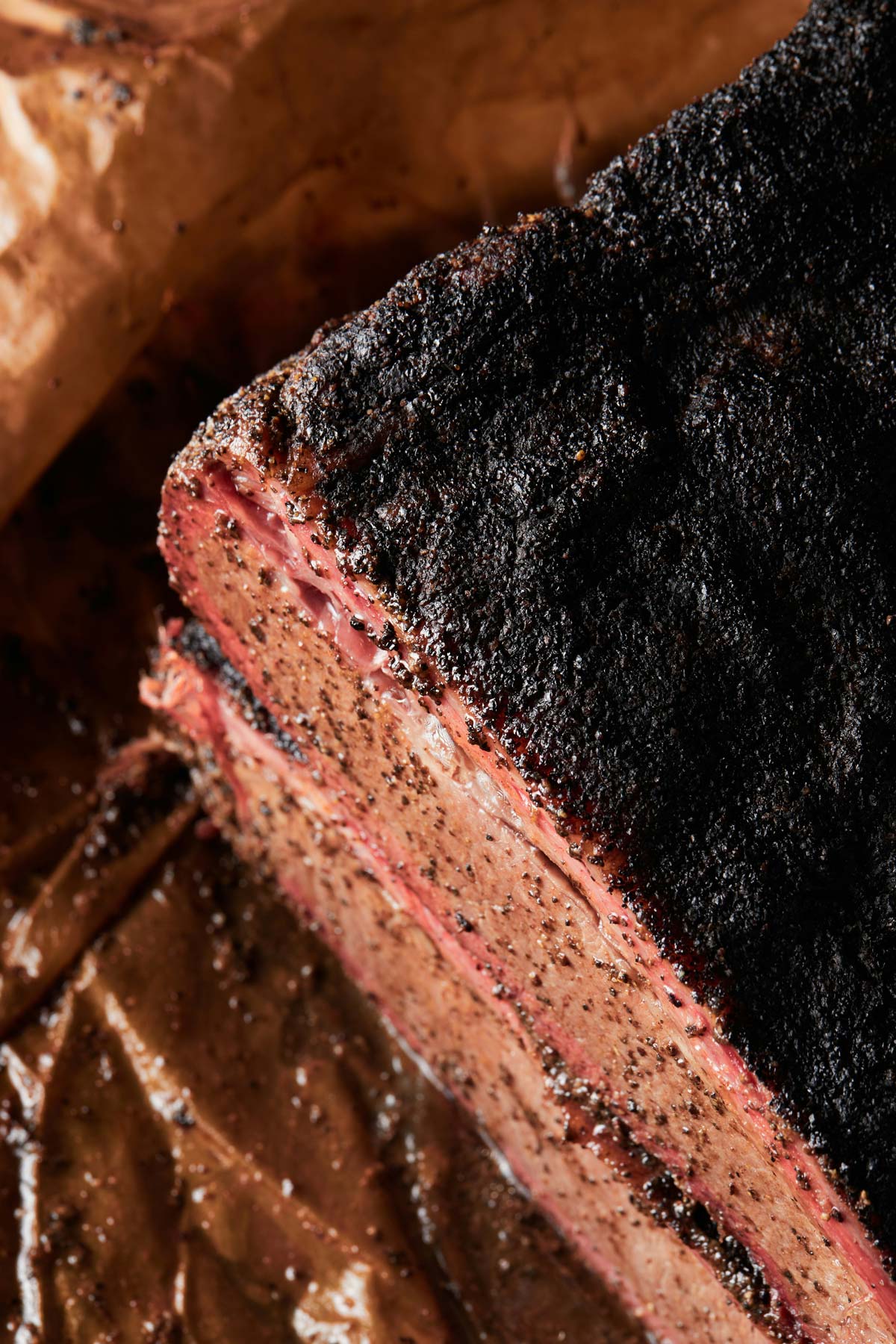 • Remove the brisket to a large cutting board and allow to rest for 1 hour before slicing. Slice both the point and the flat against the grain with a sharp knife and serve immediately.
